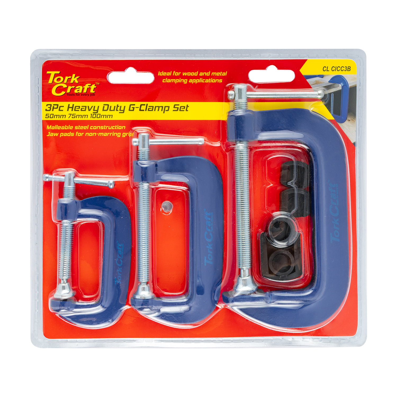 The G-clamp is manufactured from carbon steel and has been powder coated.