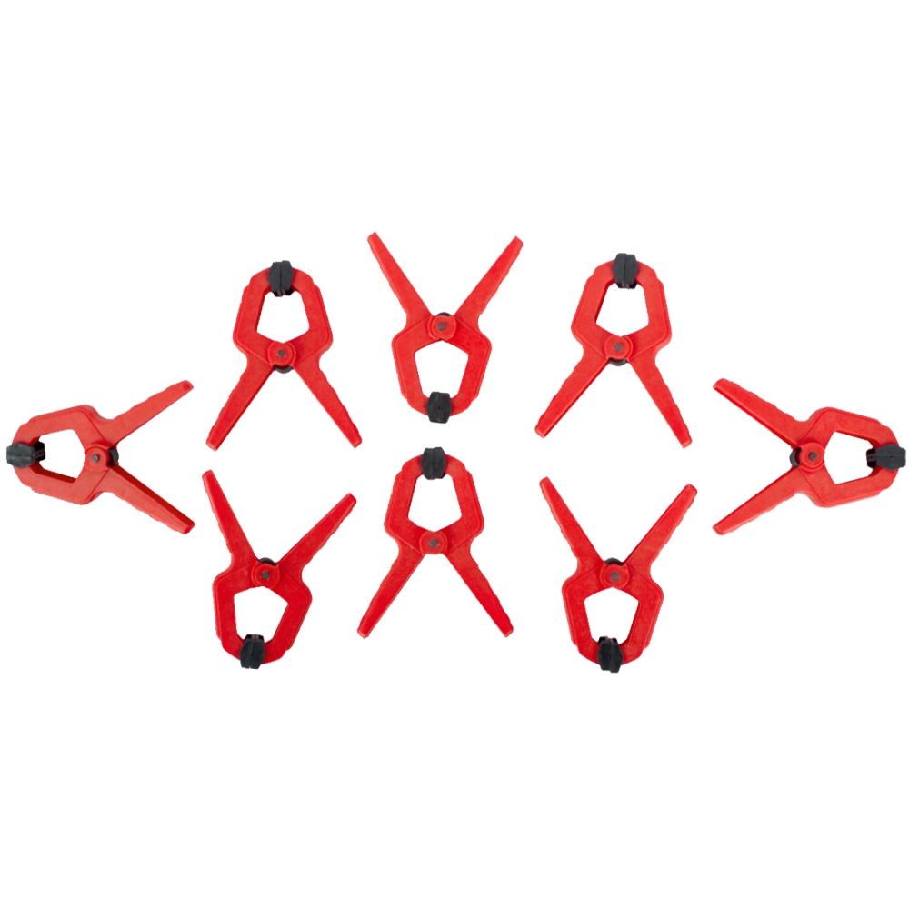 A handy set of eight 25 mm spring clamps with nylon construction. Ideal for gluing, positioning small workpieces, holding trim, or as workshop helpers. The nylon body resists marring, and the spring mechanism ensures firm grip with reasonable flexibility.