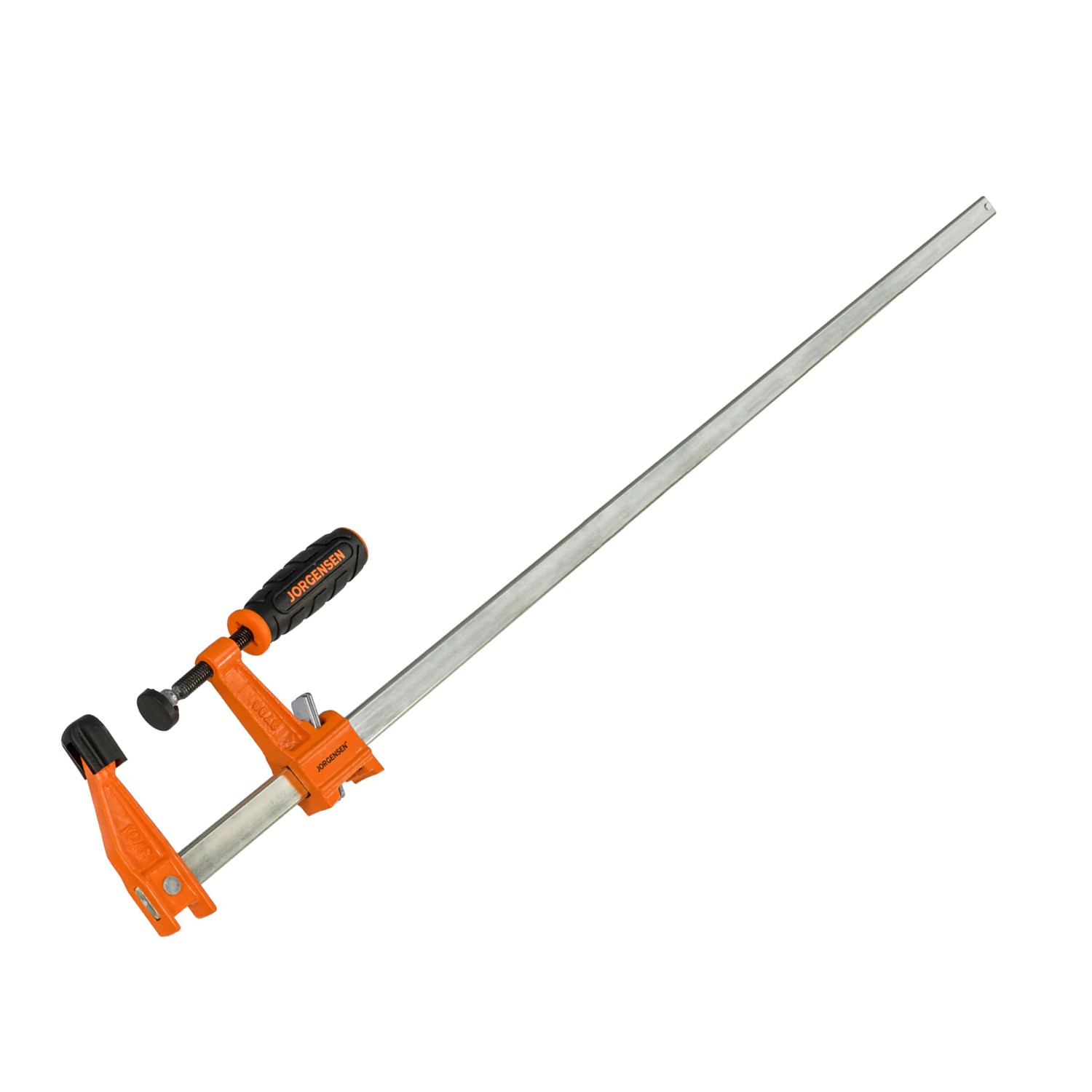 Jorgensen steel bar clamps are seriously strong. Cast-iron stationary and sliding heads with an orange, powder coated